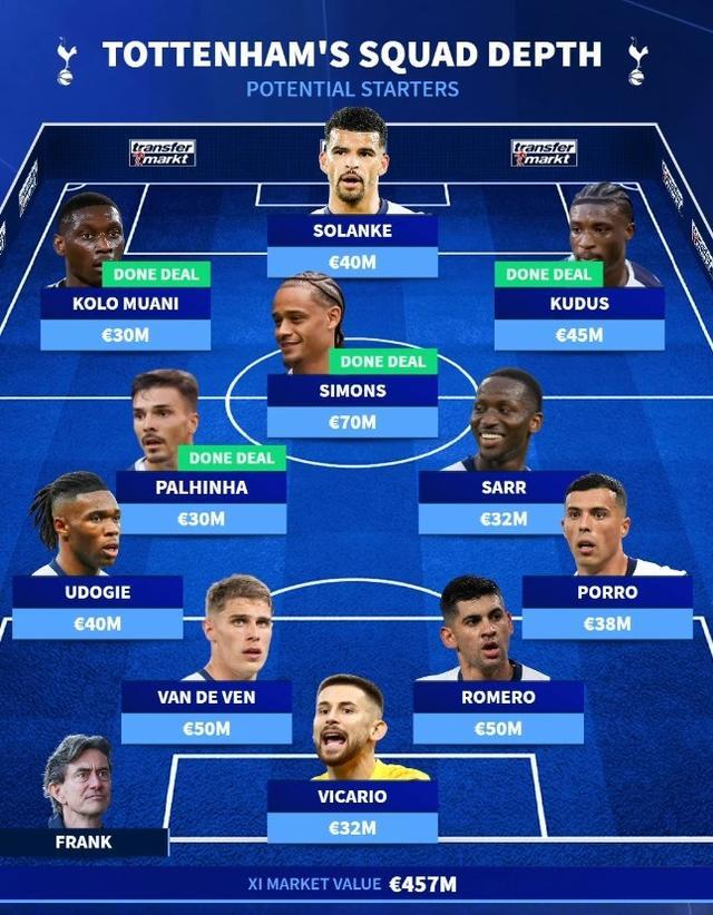 9月6日的“转会市场”的直播界是托特纳姆热刺新赛季的两个阵容,Xavi Simmons领先五名新球员。 Main team: total value of 457 million strikers: Muani (30 million), Solank (40 million), Kudus (45 million) midfielder: Palinia (30 million), Xavi Simmons (70 million), Pape Saar (32 million) Guards: Udoji Million) Purpose: Vicario (32 Replacement: Total value is 287 million strikers: Terr (35 million), Richarlison (20数百万),约翰逊(4000万)中场球员:Bentancur(3000万),Odobel(2000万),Berival(3800万)登记(600万)(3,800万),登记员(3800万)守门员:金斯基(1500万)英超联赛的独家观看